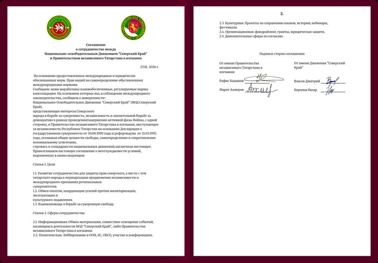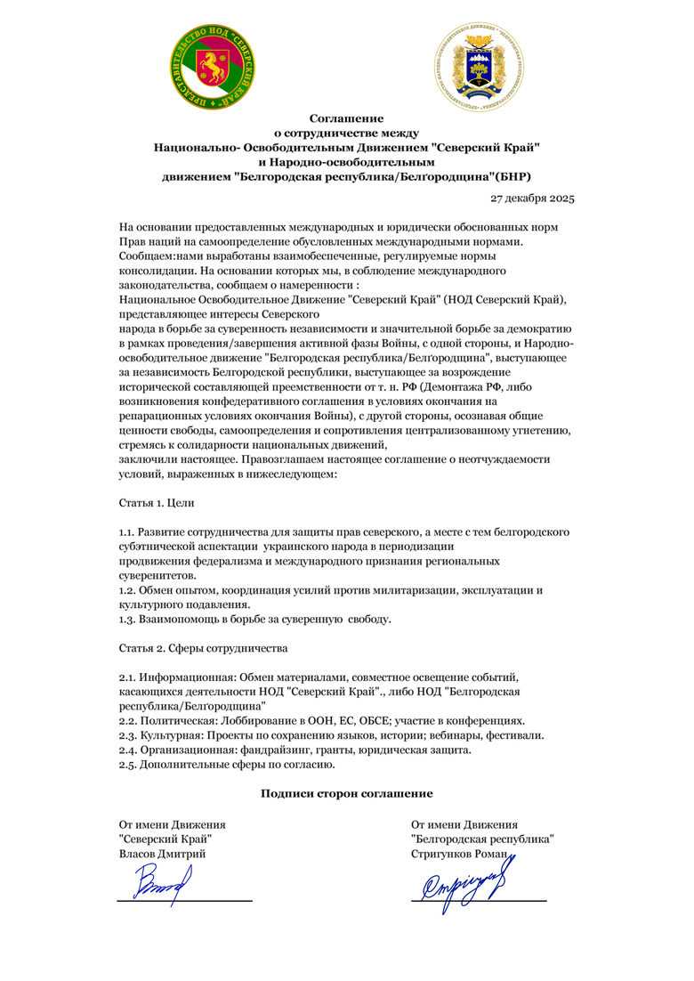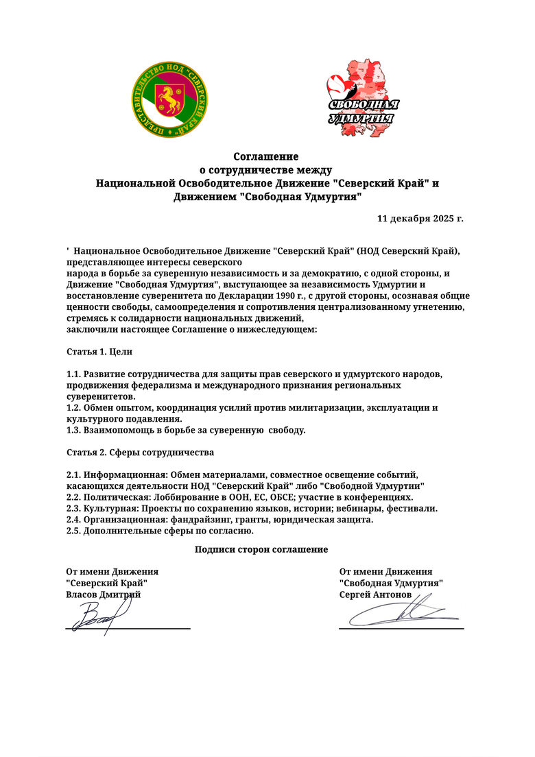 Здесь все документы которое Представительство Национальной Освободительное Движение Северский Край заключал соглашение о взаимо сотрудничества с другими Движениями Поневольнных народов.